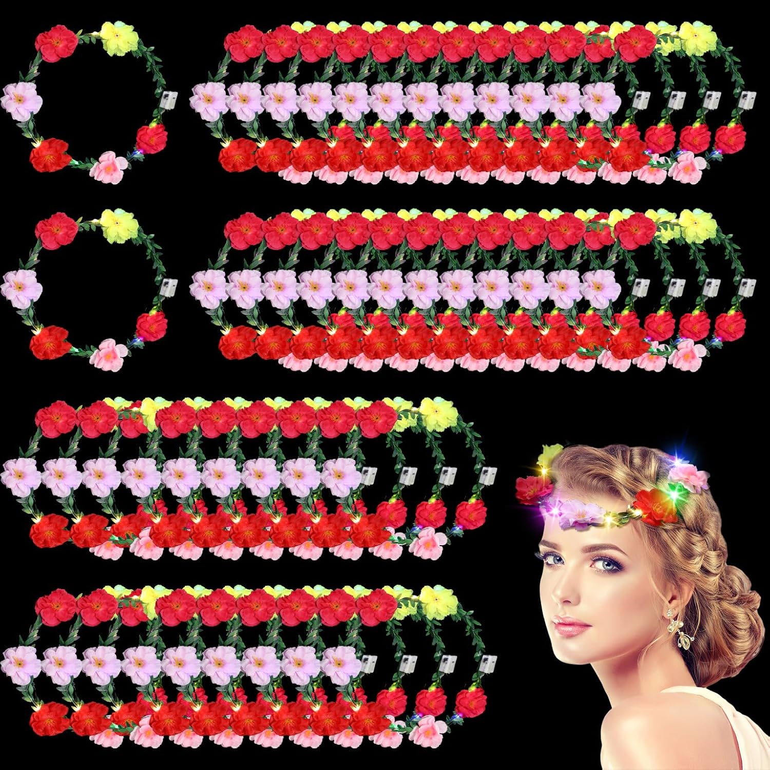 - What You Get: 50 pieces colorful LED flashing flower headbands, each flower crown has 6 flowers, and the corresponding LED lights are configured to glow in the dark; The floret is designed with different colors, exquisite and beautiful, so that you can attract attention faster