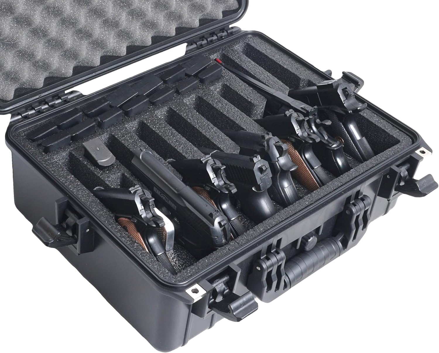 8 Pistol Waterproof Case. 6 Semi-Autos + 2 Wheel Guns. Heavy Duty, Airtight, Padlockable. Pre-Cut Foam for Wide Variety of Firearms. Also fits 24 Mags.