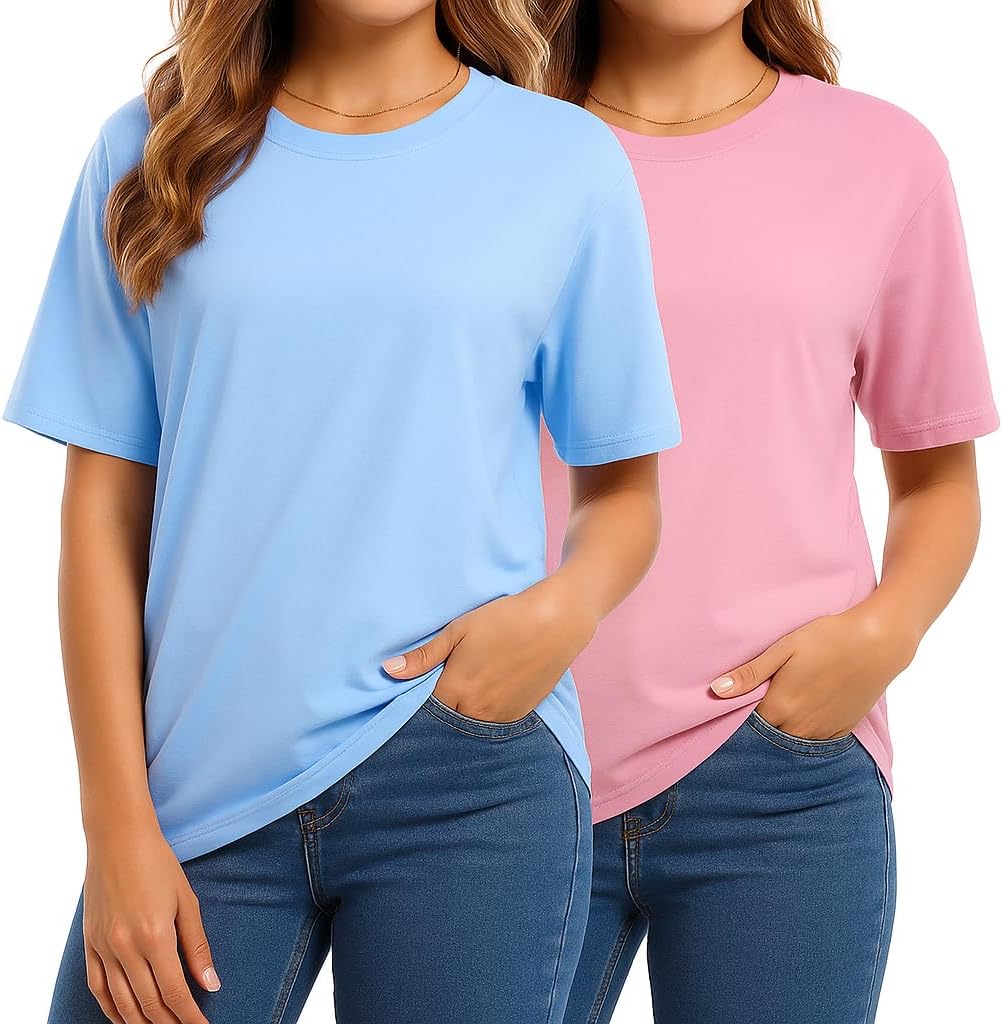 Combed Cotton Summer Tops for Women – Short Sleeve Crewneck T-Shirts, Compact Knit Loose Fit Basic Tees 2 Pack Black White