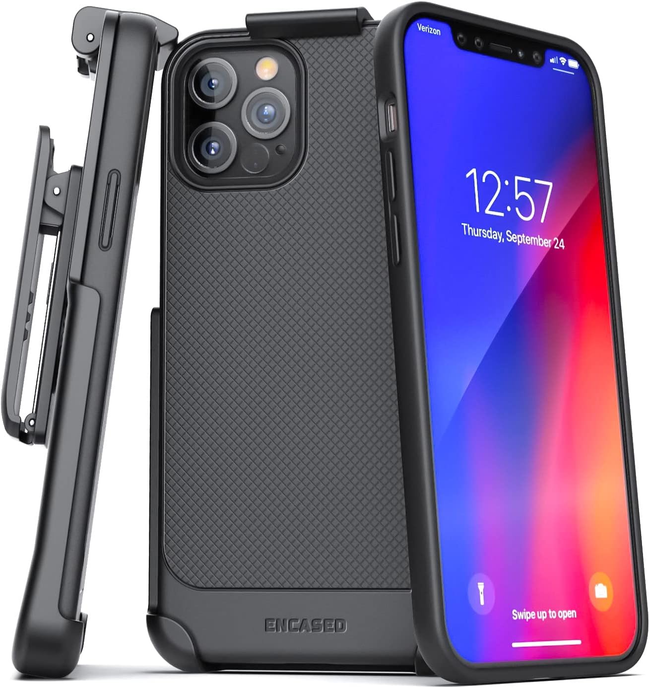 Encased Compatible with iPhone 12/12 Pro Belt Clip Case (Thin Armor) Slim Grip Cover with Holster - Black