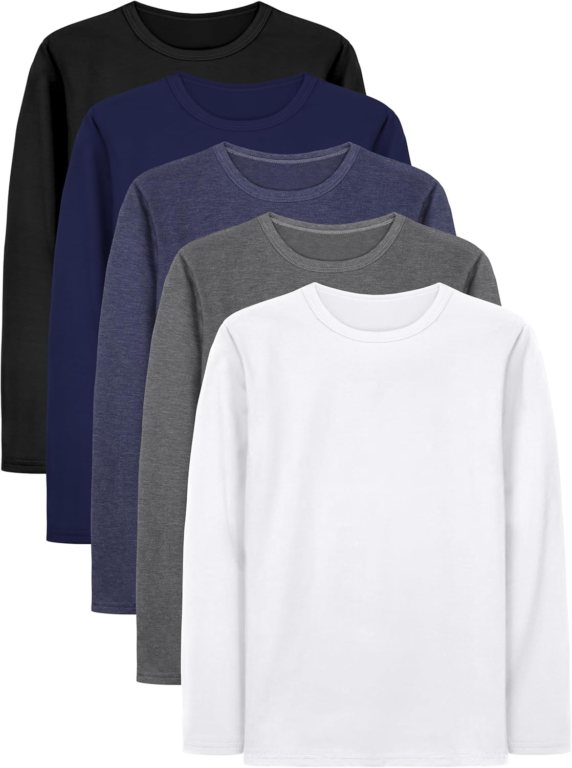 Cooraby 5 Pack Toddler Boys Long Sleeve Shirts Soft Crewneck Top Tees Shirts Kids Solid Colors 2-14 Years