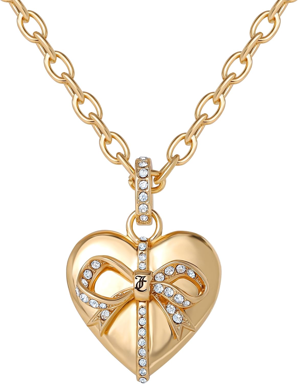 Juicy Couture Bow Wrap Puffy Heart Necklace with Clear Crystals, 18"+3" Gold-Tone Heart Jewelry, Valentines Day Gifts for Her