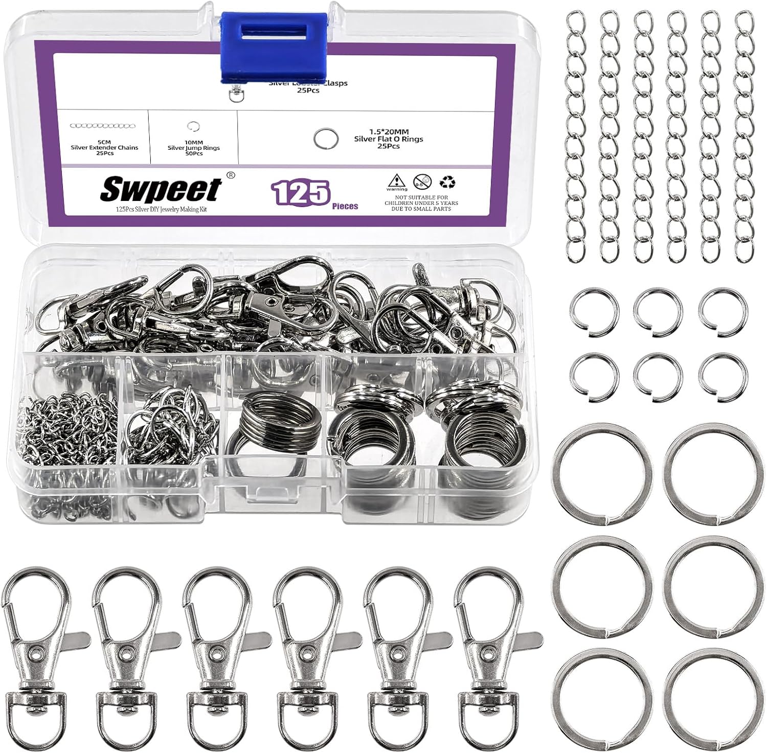 Swpeet 125Pcs Silver Keychain Making Set, 25Pcs Swivel Lanyard Snap Hook, 25Pcs Keychain Ring, 25P Extender Chains, 50P Open Jump Rings, Swivel Lobster Clasps, Keychains Clips