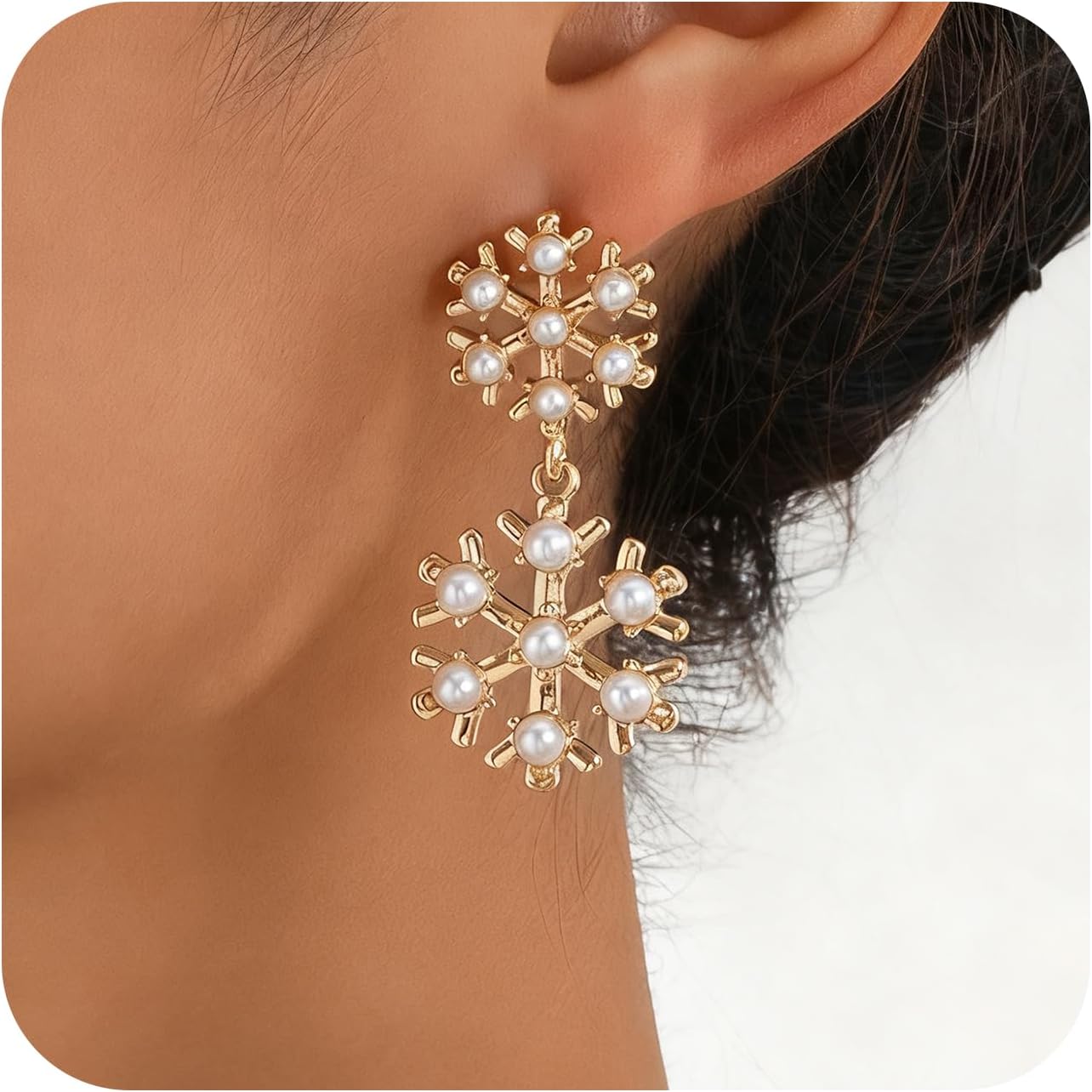 Christmas Snowflake Earrings Snowflake Faux Pearl Dangle Drop Earring Winter Earrings Christmas Holiday Jewelry for Women