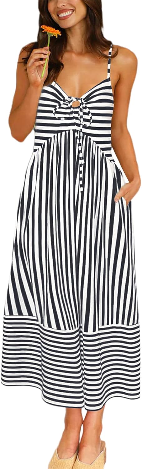 Fashionme Womens Summer Maxi Dresses 2026 Trendy Striped Vacation Boho Beach Spaghetti Strap Sundress Back Tie with Pockets