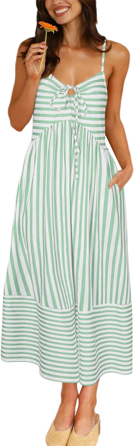 Fashionme Womens Summer Maxi Dresses 2026 Trendy Striped Vacation Boho Beach Spaghetti Strap Sundress Back Tie with Pockets
