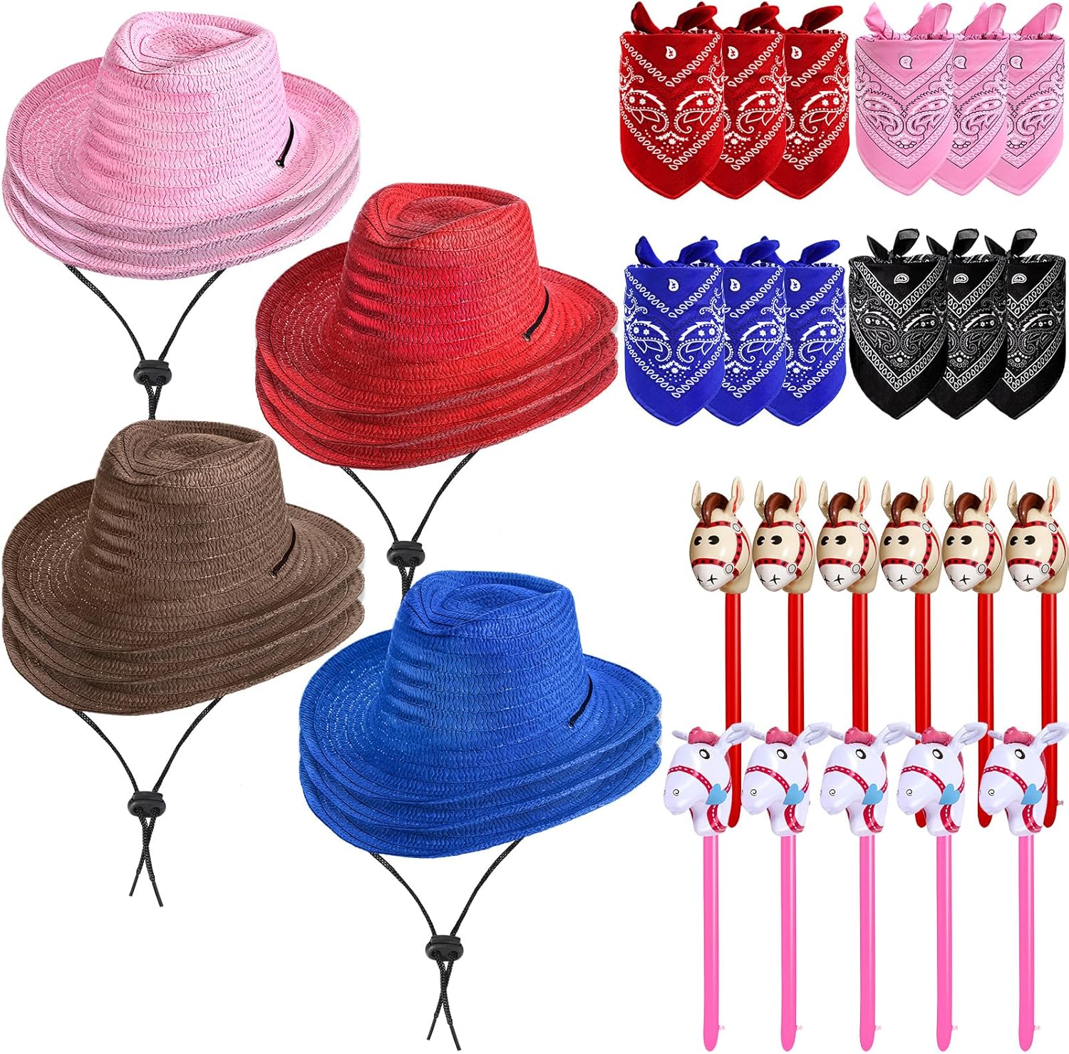 Toulite 36 Pcs Western Cowboy Party Costume Set Cowboy Hats Paisley Bandanas Inflatable Stick Horses for Western Party Favors