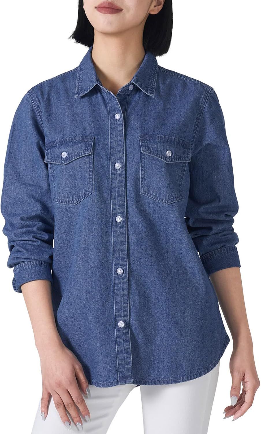 HISEA Women's Denim Button Down Shirt with Long Sleeve, Blue Jean Lightweight Shacket for Women, Womens Washed Chambray Coat