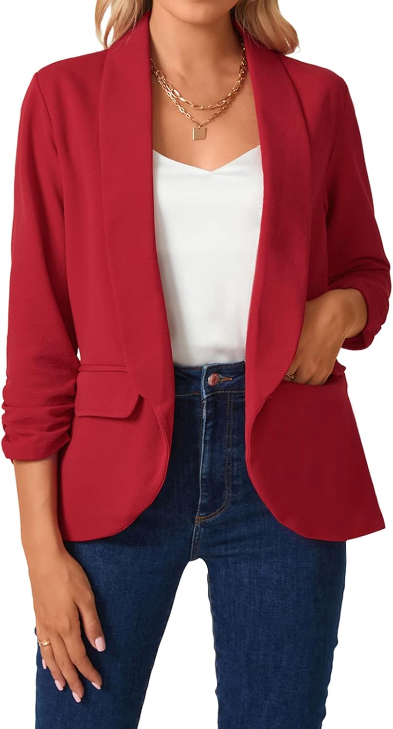 MINTLIMIT Womens Blazer 3/4 Ruched Sleeve Shawl Collar Business Work Blazers Open Front Casual Jackets with Pockets