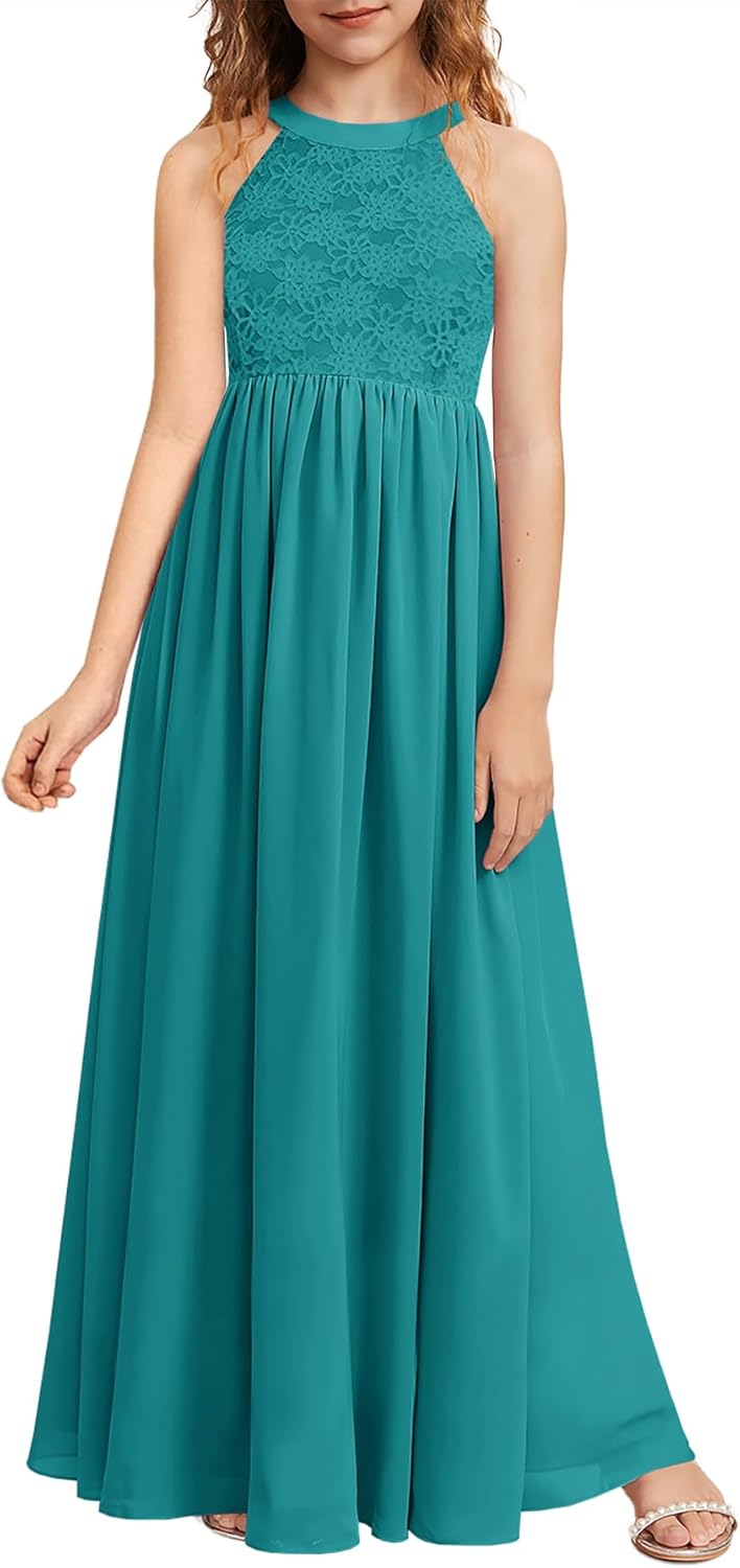 HOSIKA Girls Halter Neck Sleeveless Elegant Lace Chiffon A-line Long Flower Girl Dress for Wedding Party 6-12 Y