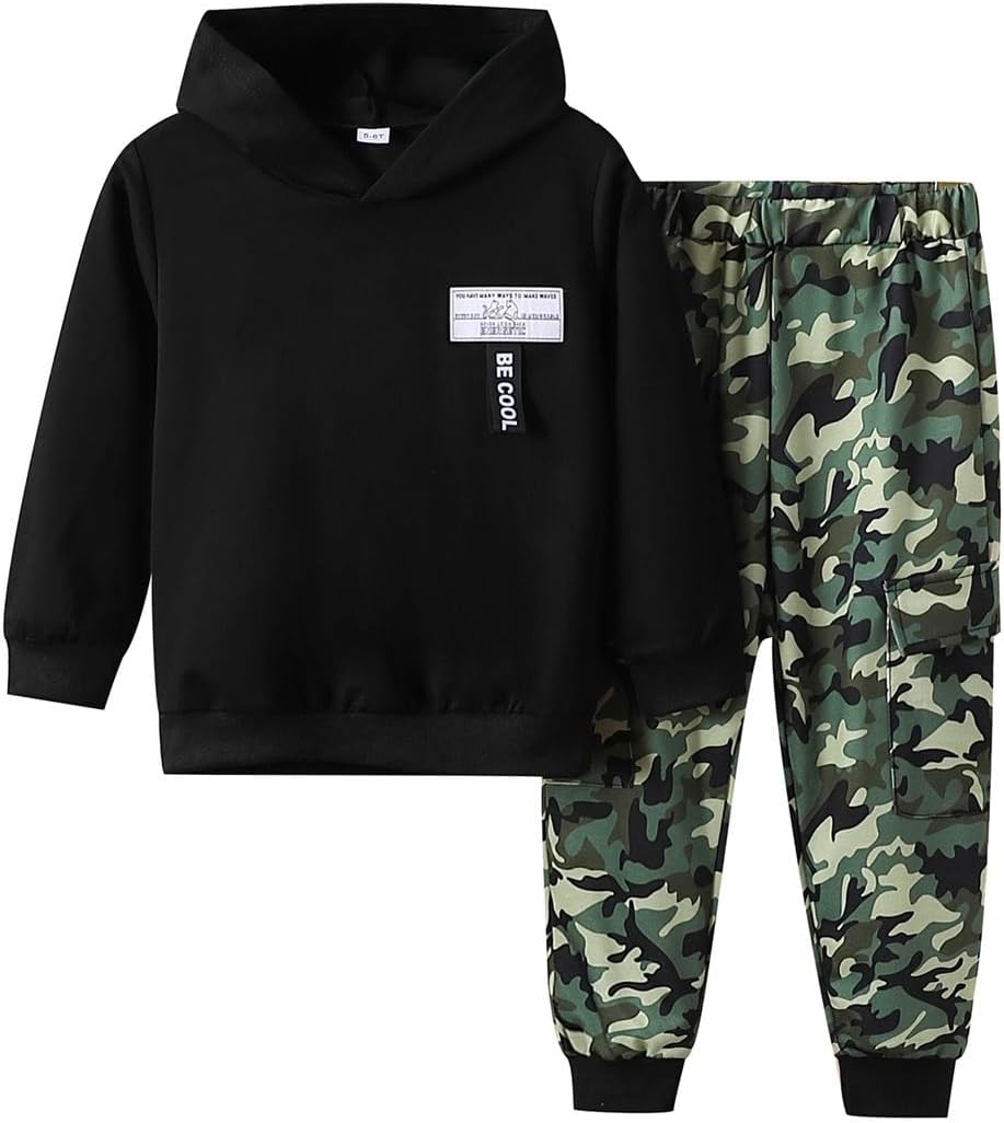 Boys 2 Piece Outfits Long Sleeve Hooded Sweatshirt Top Camouflage Sweatpants Fall Winter Clothing Set 5-10T