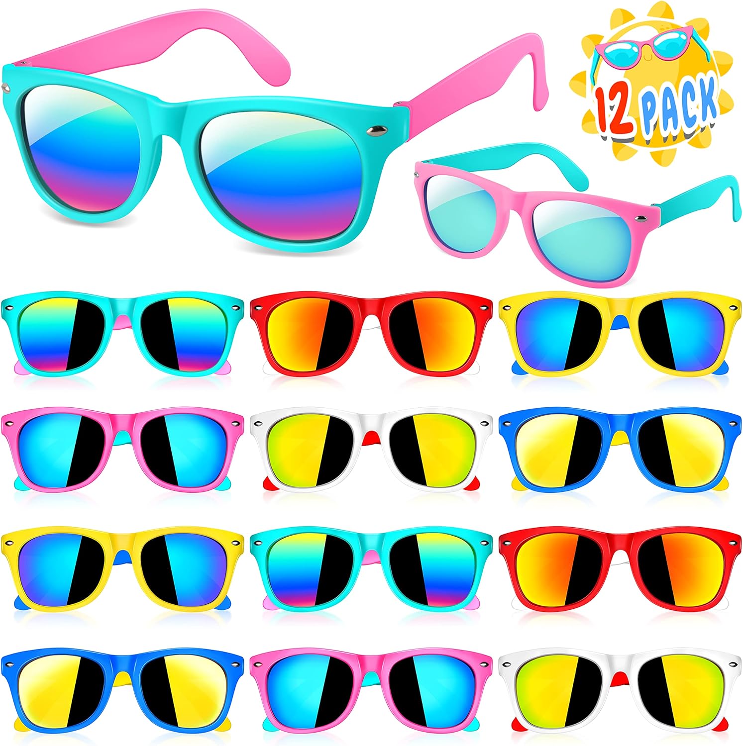 - VALUE BULK SUNGLASSES FOR KIDS - Pack of 12 GIFTINBOX kids sunglasses bulk includes 6 bright colors: red, pink, yellow, blue, turquoise and white! Great for giving as party favors to kids age 3-8! These kids sunglasses party favor are perfect for beach, pool parties, classroom handouts and prizes, Easter basket stuffers, birthday party supplies and everyday use!