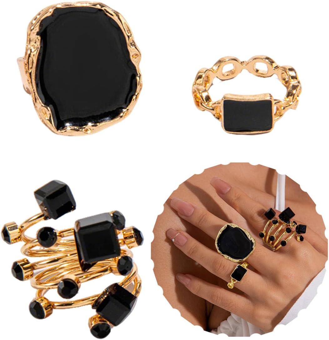 LadayPoa 3Pcs/Set Vintage Statement Rings for Women, Dainty Cocktail Stacking Rings, Gold Plated Black Layered Finger Ring, Big Chunky Geometric Punk Jewelry Accessories Festival Gifts