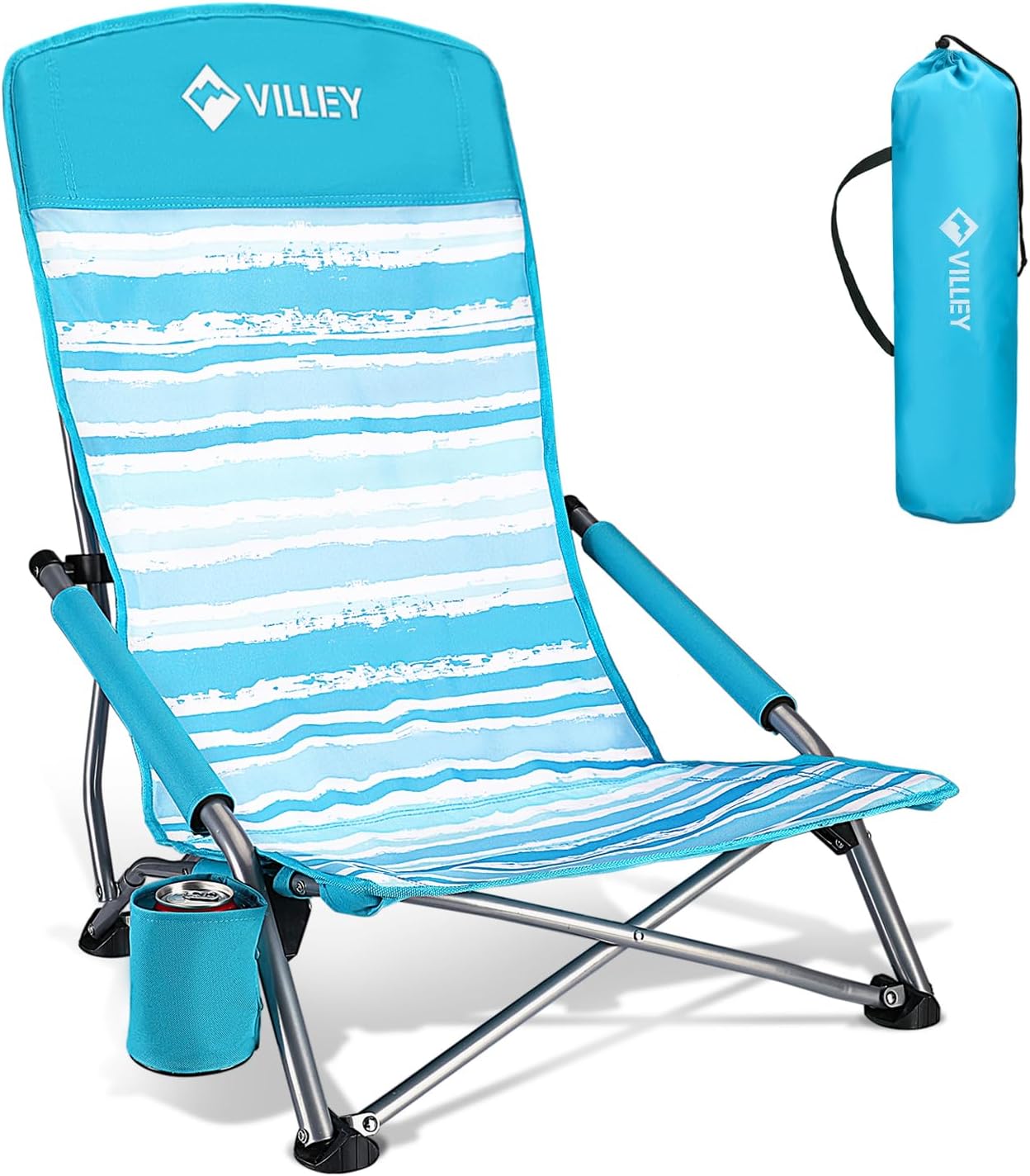 VILLEY Low Beach Chair, High Back Folding Chair for Adults, Lightweight and Portable for Outdoor, Camping, Lawn, Music Festival, with Cup Holder and Carry Bag - Blue Stripes