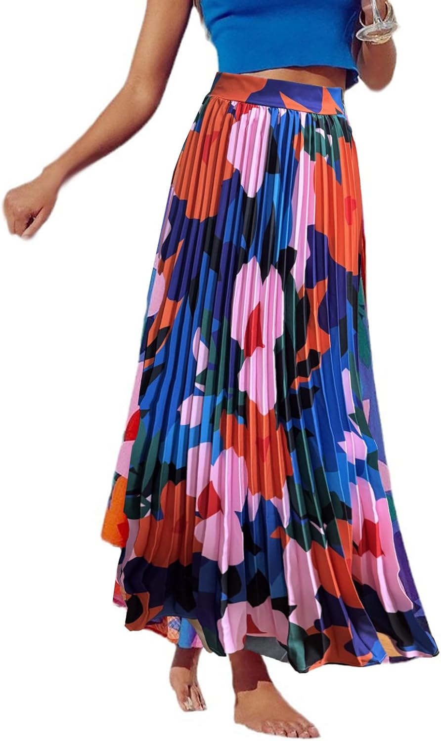 Women's 2025 High Waist Floral Long Skirts Boho Pleated Swing A Line Beach Maxi Skirt