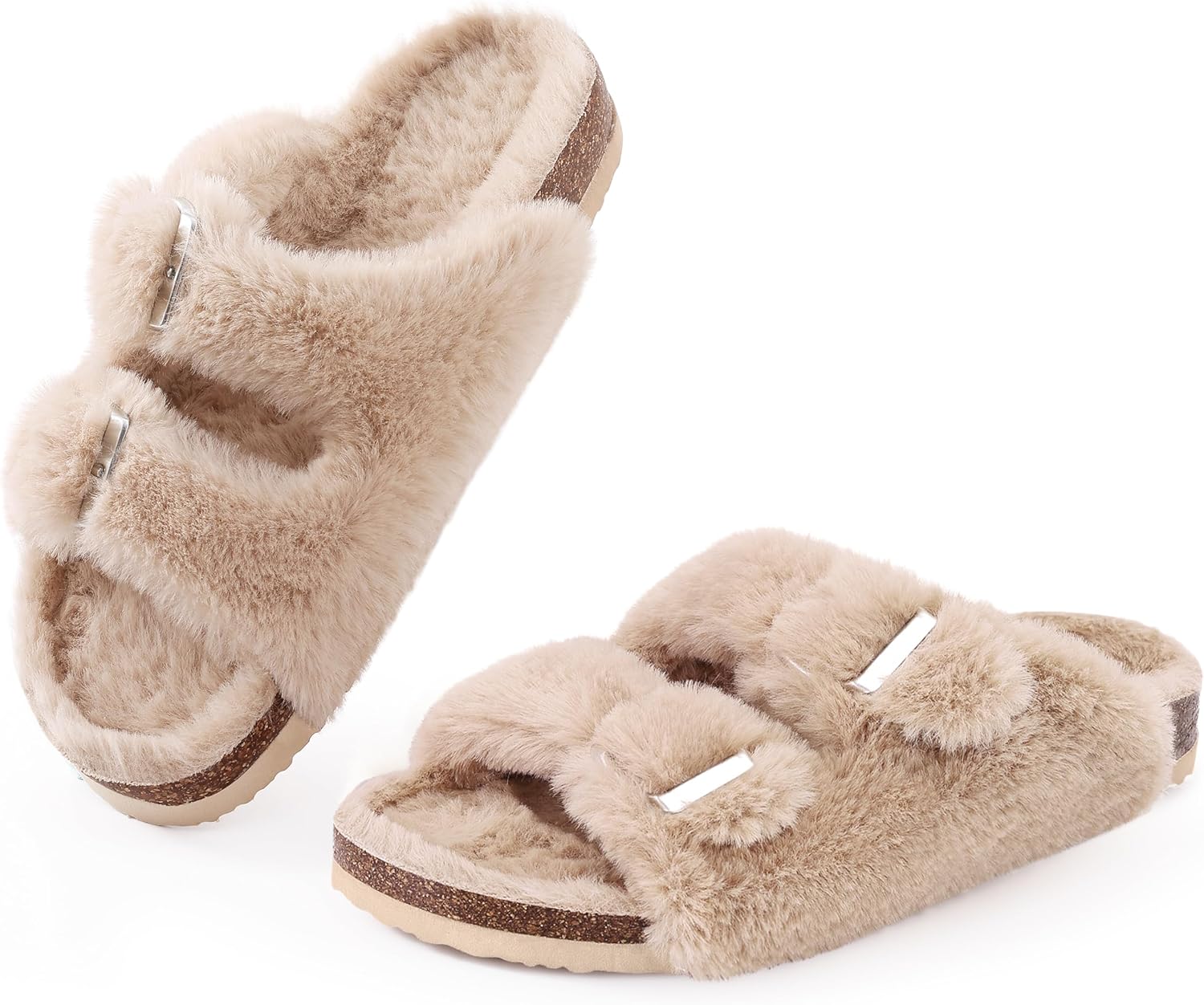 KIDMI Fuzzy Slippers Women with Cork Footbed Fluffy Slides Open Toe Indoor House Shoes | Arch Support | Adjustable Buckles