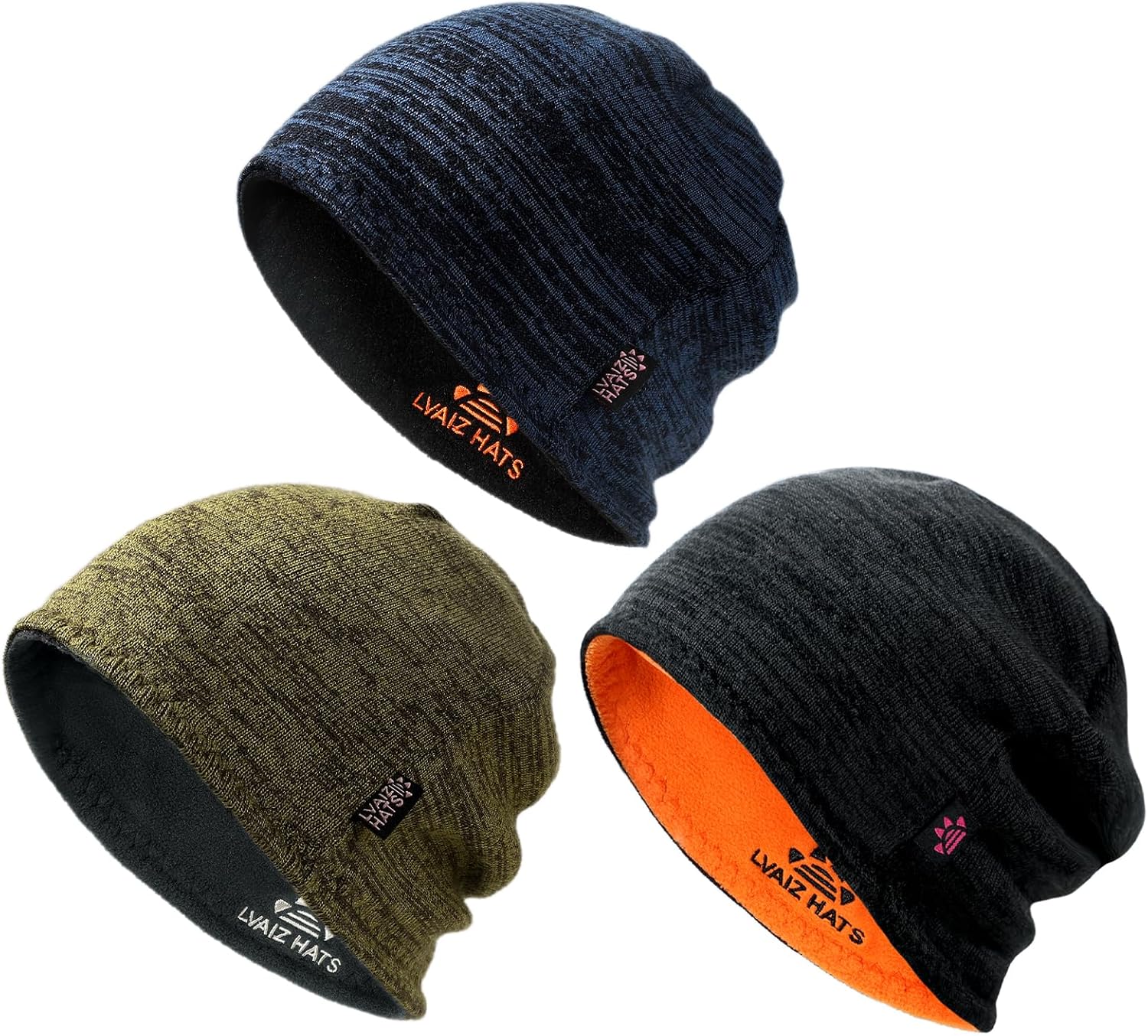 3 Pack Reversible Winter Fleece Lined Beanie Hats for Men Women Warm Windproof Cotton Stretchy Knitted Skull Caps
