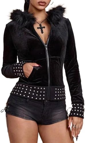 Y2K Rivet Faux Fur Hoodies For Women Zip Up Punk Gothic Stripe Slim Fit Trendy Tops Long Sleeves Casual Jacket