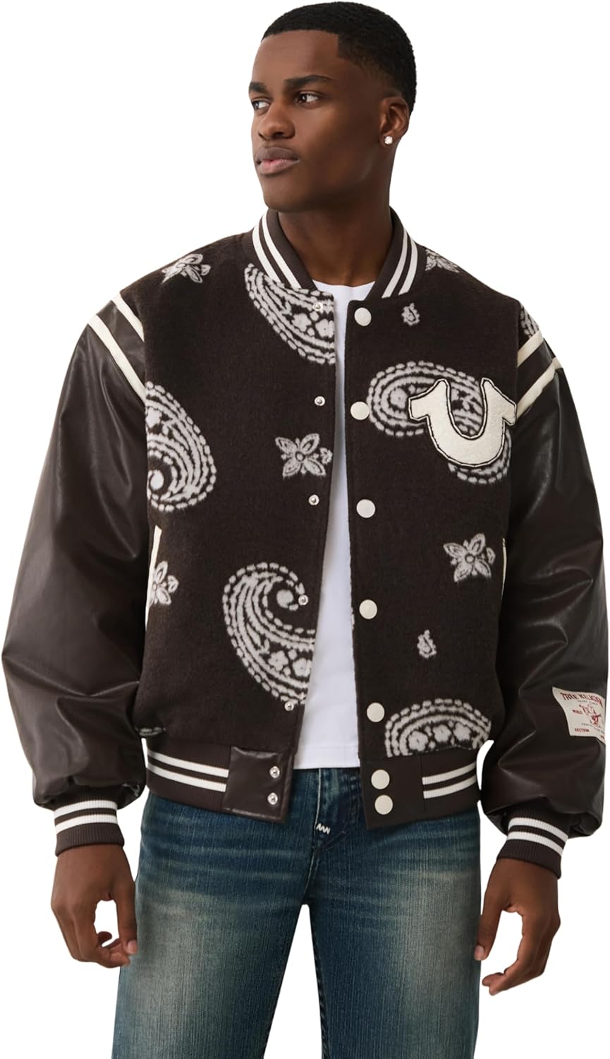 True Religion Men's Wool Retro Varsity Jacket – Classic Letterman Bomber with Logo Patches