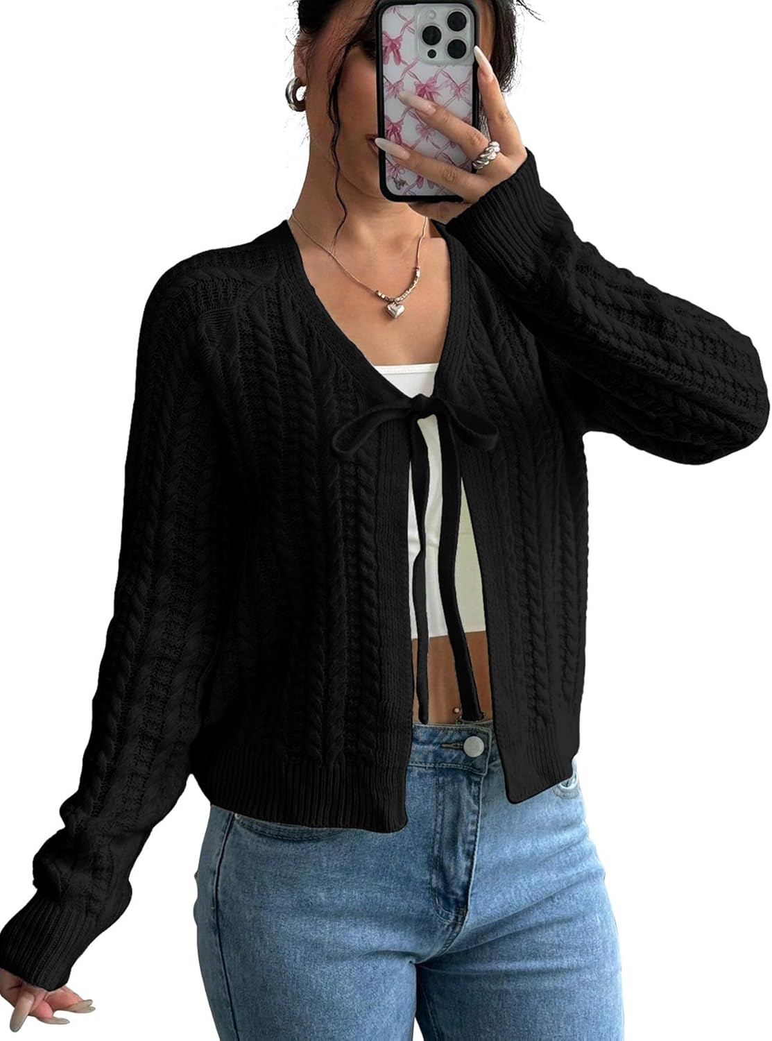 Narecte Cardigan Sweaters for Women V Neck Cropped Bow Tie Front Cardigan Long Sleeve Tops Knit Fall Winter Outfit