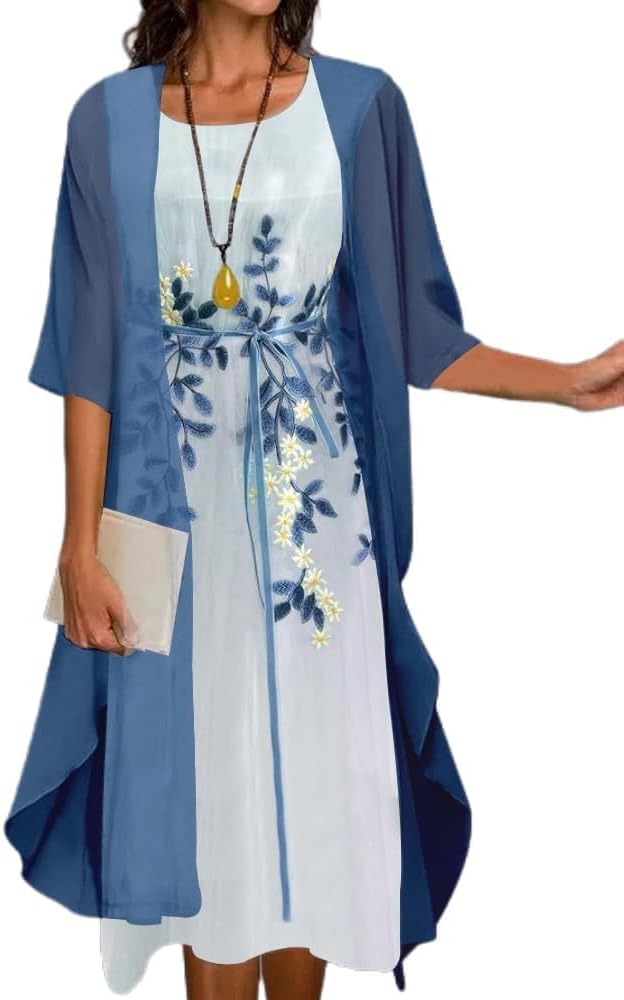 Women's Elegant Two-Piece Set Wedding Guest Formal Cocktail Dress with Jacket Flowy Casual Boho Floral Midi Dress