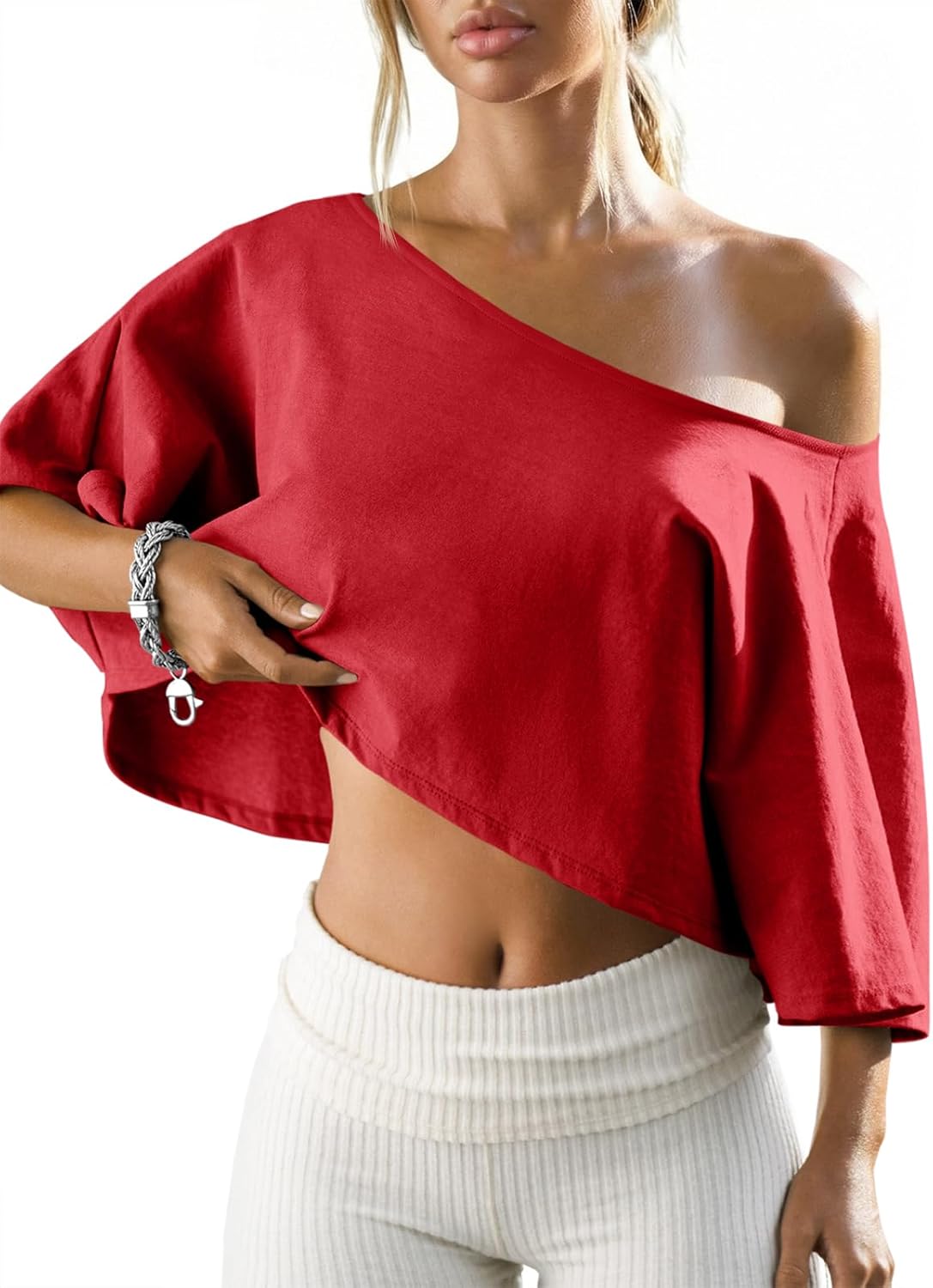 Fisoew Womens Off The Shoulder Cropped Tops Batwing Short Sleeve Workout Shirts Asymmetrical Neck Summer Casual T Shirts