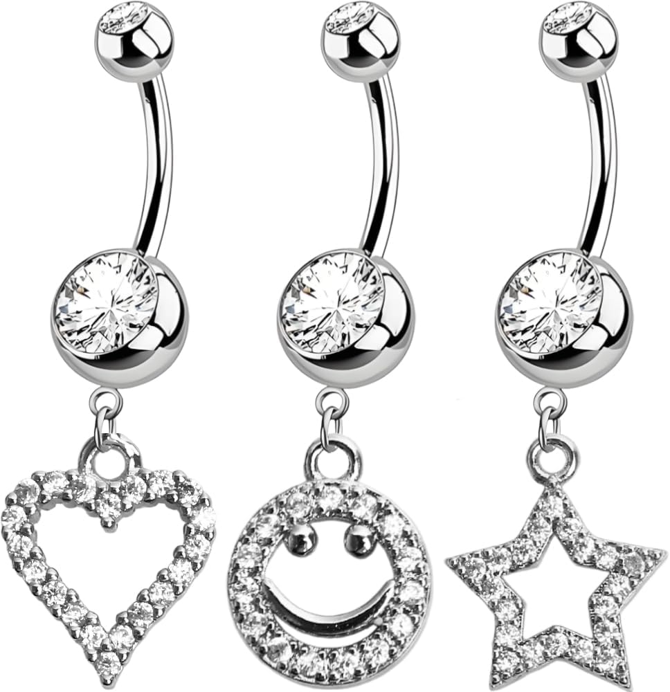 Heart Smile Belly Button Ring Piercing 3Pcs 14G Surgical Stainless Steel Navel Piercing Jewelry Hypoallergenic Cute Star Belly Button Rings for Women