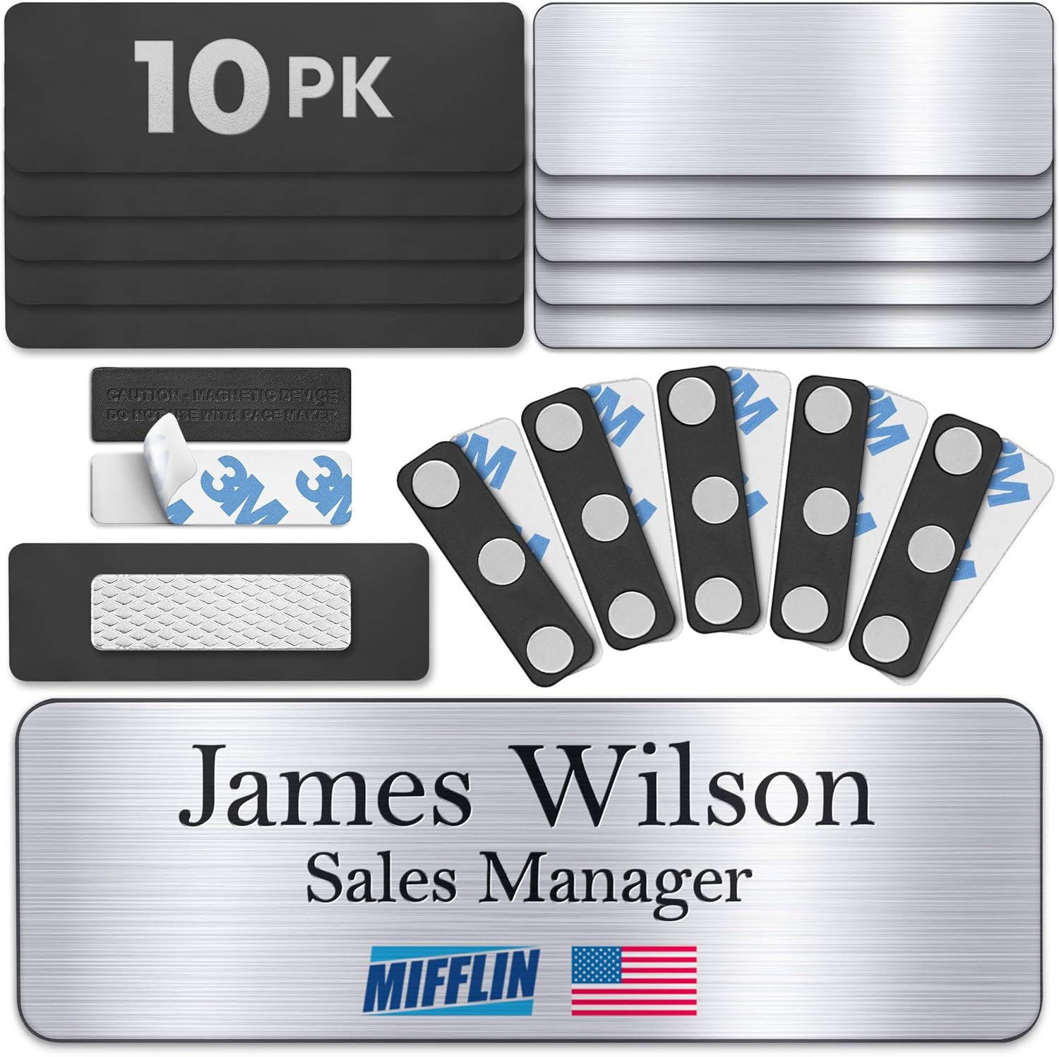 Mifflin - Magnetic Name Tags - 1" x 3", Silver, 10 Pack - Blank Engravable and Customizable Nametags - ABS Front, Iron Back, and Strong Magnet Plate - Stick ID Badge or Write/Engrave Names