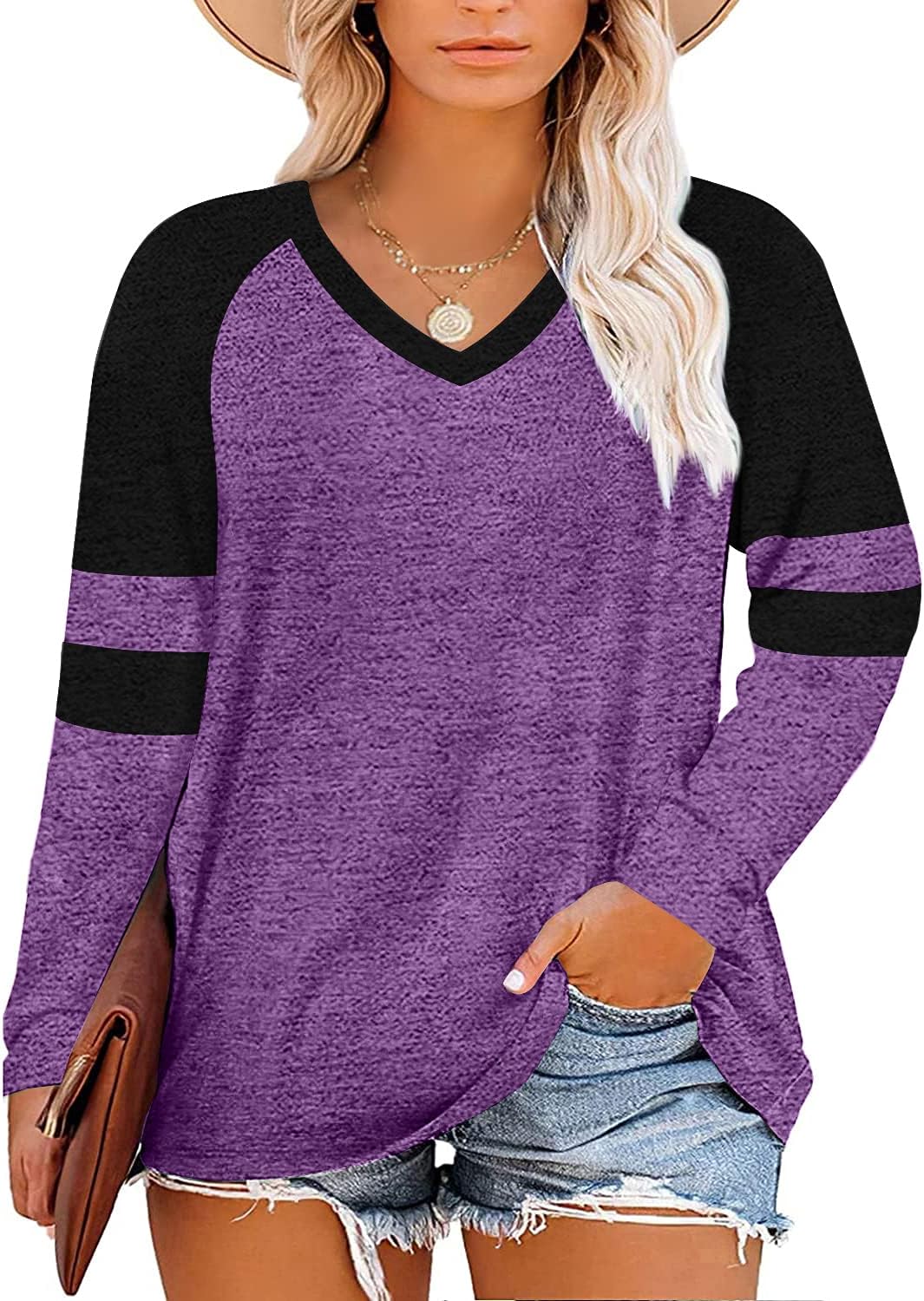 Haloumoning Women's Plus Size Tops Striped Long Sleeve V neck T Shirts Color Block Casual Tunics Tee Shirt