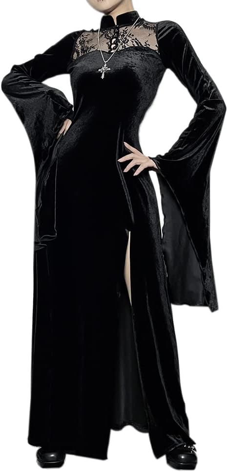 LANSHULAN Long Flare Sleeve Dress Lace Cutout Black Split Goth Vintage Dress Clothes