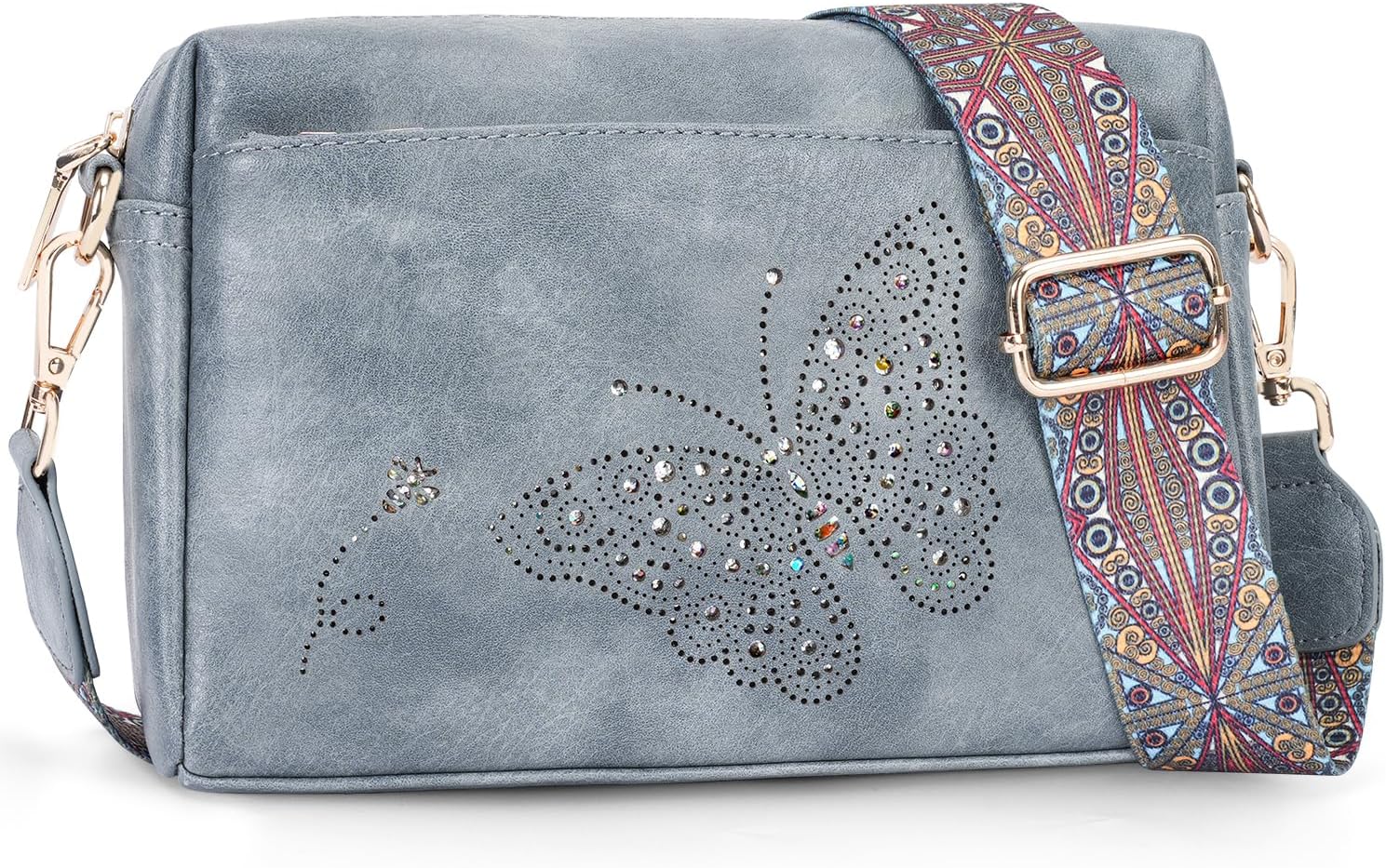Crossbody Bags for Women, Vegan Leather Small Crossbody Purse Butterfly Shoulder Handbags with Wide Strap