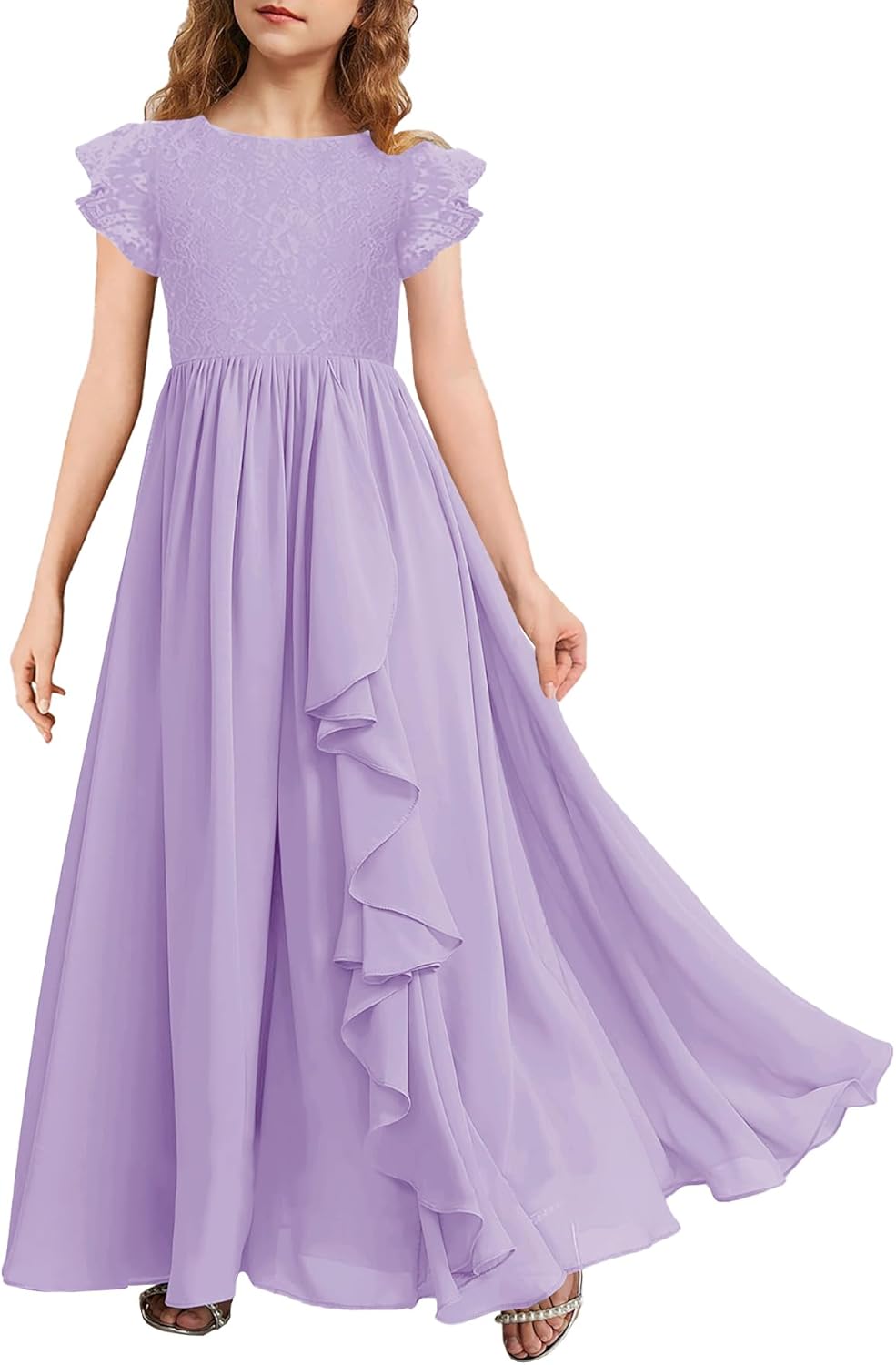MITILLY Girls Lace Flower Maxi Dress Ruffle Sleeve A-Line Flowy Junior Bridesmaid Chiffon Dresses for Wedding Party
