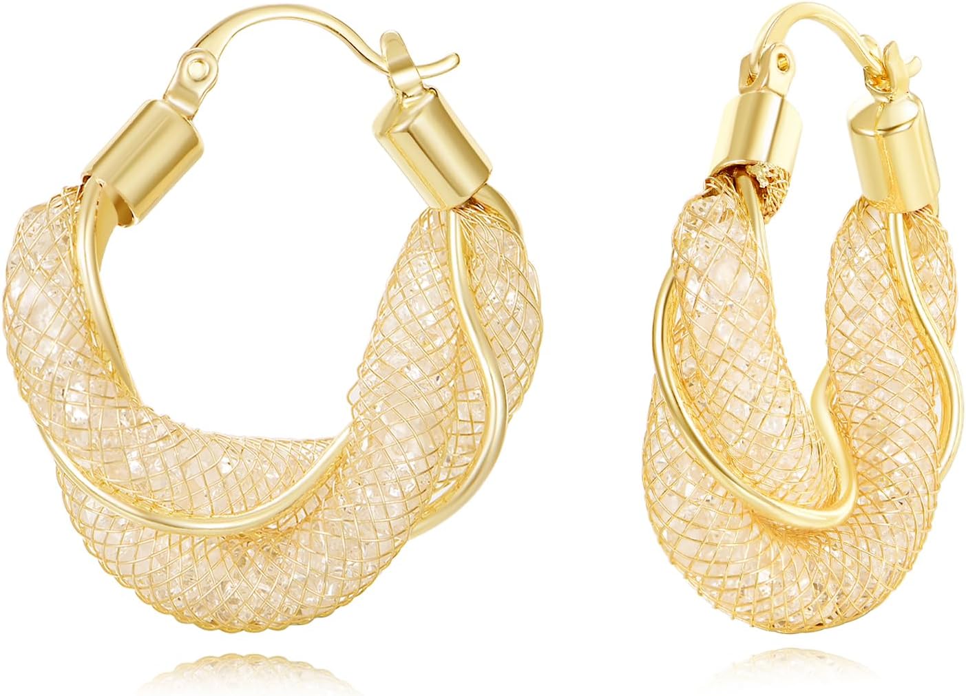 14K Gold Mesh Hoop Earrings for Women Gold Earrings Trendy Chunky 14 Karat Hoop Earring for Women