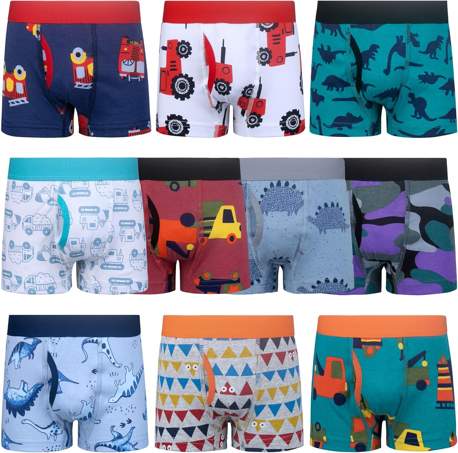 BIG ELEPHANT Boys Boxer Briefs 10-Pack, 100% Cotton Toddler Underwear, Dinosaur and Car Print, Soft Breathable Underpants
