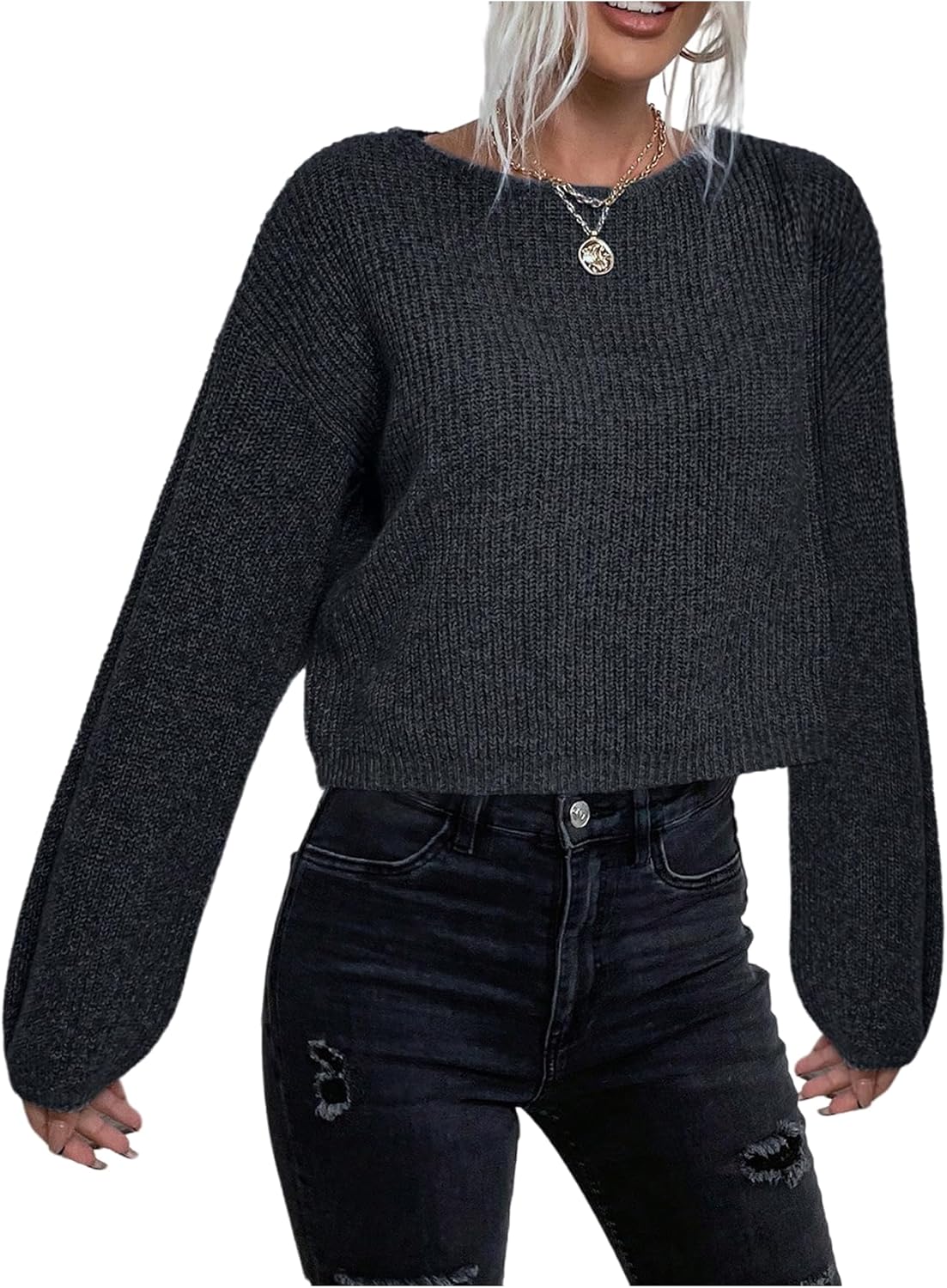 Floerns Women's Fall Long Sleeve Ribbed Knit Sweater Crop Top Casual Dropped Shoulder Crew Neck Loose Fit Pullover Sweaters