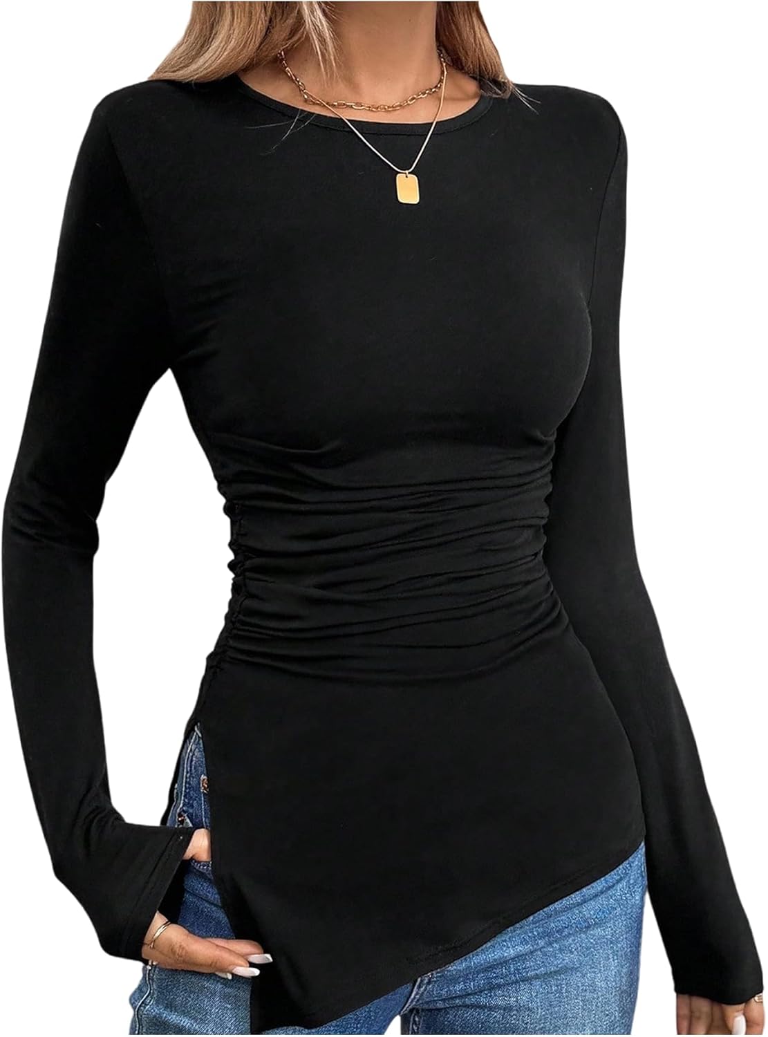 Women's Ruched Split Hem Tops Dressy Casual Crew Neck Long Sleeve Fitted Fall Work T Shirts