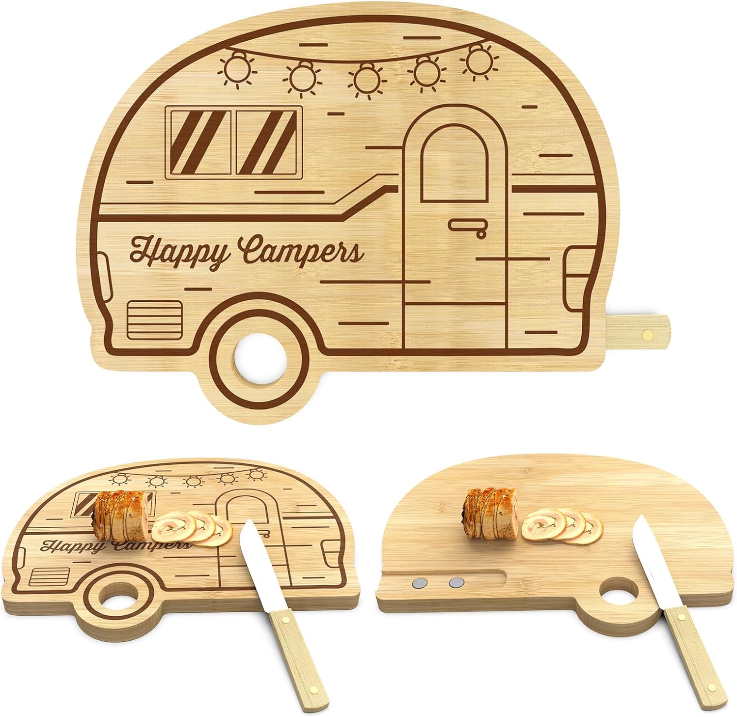 - ✅Unique Camper Design - Stand out with our charcuterie board set, featuring a distinct and eye-catching RV design that combines functionality and style. Bamboo cheese board to serve as a cutting board, camper accessories, charcuterie board, or even a stylish serving tray for other appetizers.The board is beautiful,and with its warm, natural tones makes the food placed on it look inviting.It has all the features and you will like without adding the bells and whistles that may look fancy but never get used