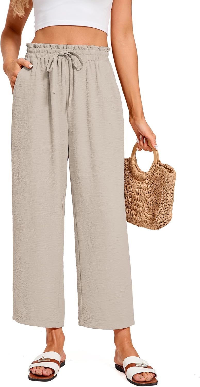 Wide Leg Pants Woman Casual Flowy Palazzo High Waist Cropped Trousers with Pockets Summer Beach Vacation Clothes