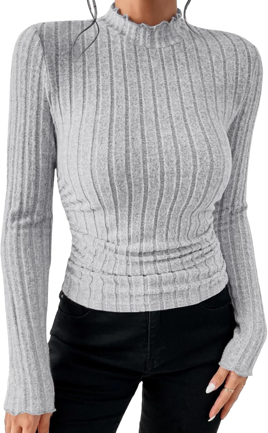 Women's Frill Mock Neck Rib Knit Long Sleeve Blouse Shirt Top