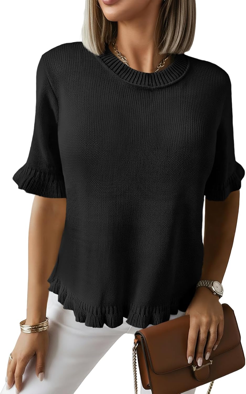 Saodimallsu Womens Short Sleeve Sweater Tops Summer Ruffle Casual Loose Fitting Crew Neck Knit Shirts
