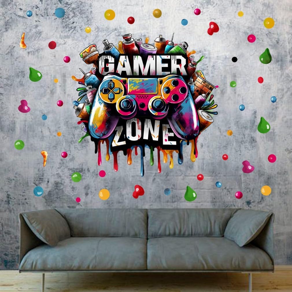 Large 3D Graffiti Gamer Zone Wall Decals (26.8”x26.4”), Watercolor Video Gaming Vinyl Wall Stickers for Game Lover, Removable Video Game Artwork for Boys Playroom Bedroom Decor
