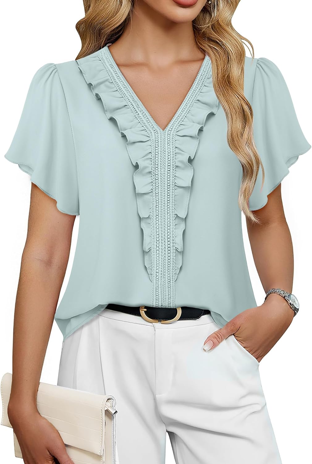 Lotusmile Womens Dressy Ruffle Tops Summer Chiffon V Neck Work Blouse Casual Flutter Short Sleeve Shirts
