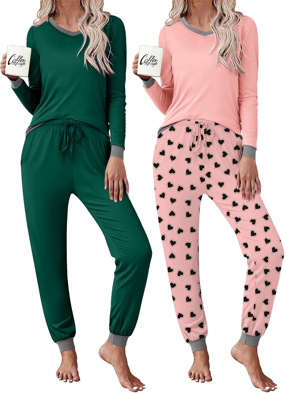 2 Pack Womens Pajama Sets Long Sleeve Sleepwear Matching Pjs Set V Neck Loungewear with Pockets S-XXL