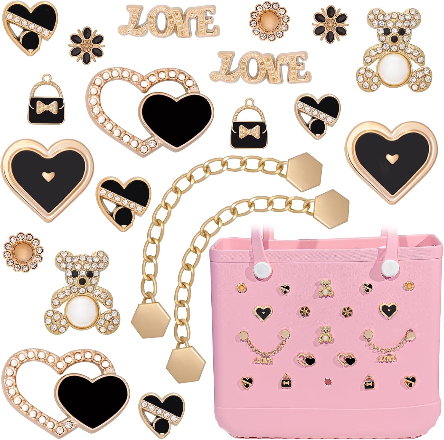 Charms for Bogg Bag, Butterfly Flowers Bear for Bogg Bag Accessories Charms, Black Heart Charm & Bling Chain Compatible with Simply Southern Beach Bags Tote, Insert for Rubber Beach Tote Handbag Birthday (20 Pcs)