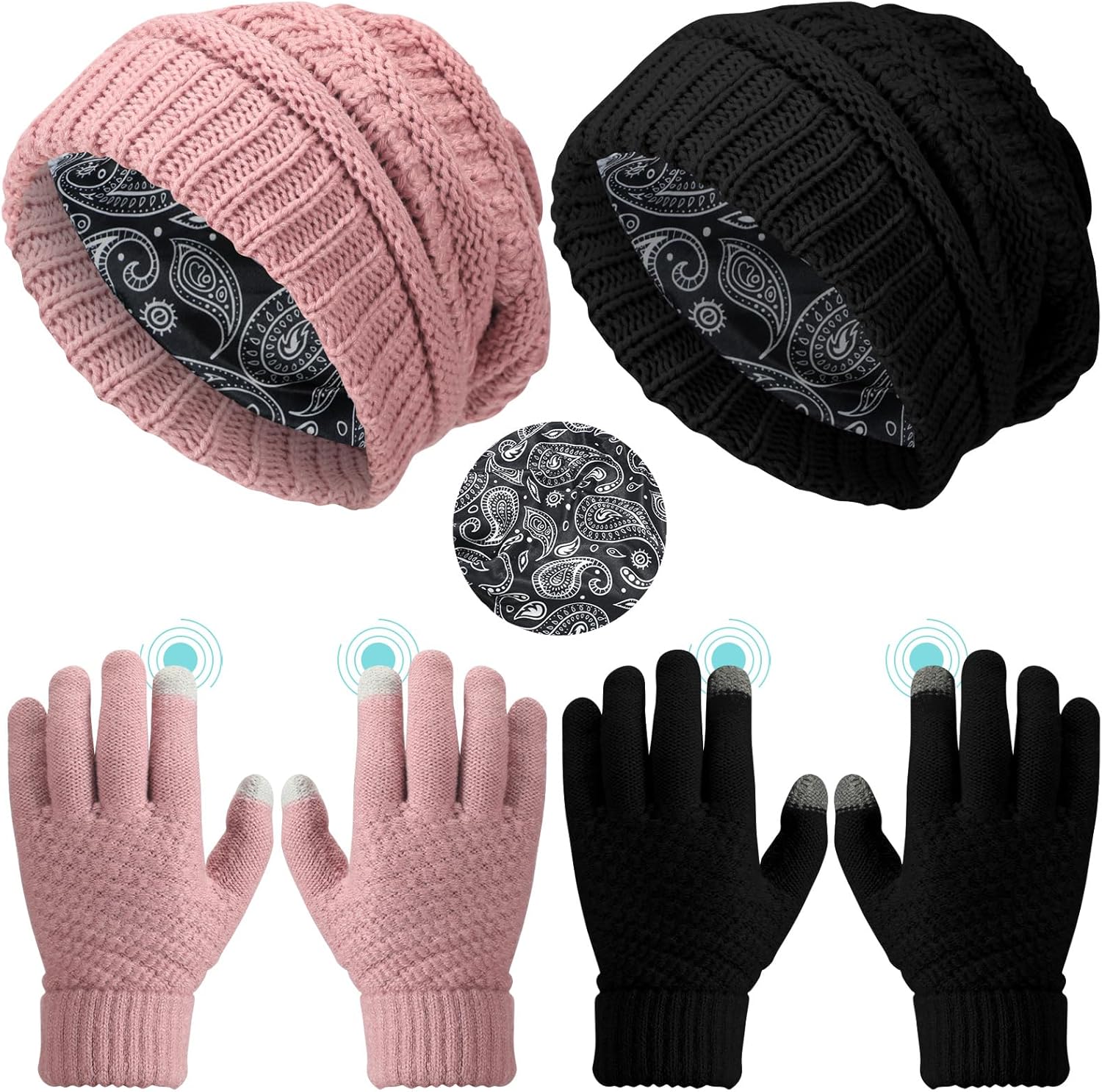 Sintege 4 Pieces Womens Satin Lined Beanie Hat Gloves Set Knit Slouchy Winter Hats Skull Cap Warm Touchscreen Gloves Set