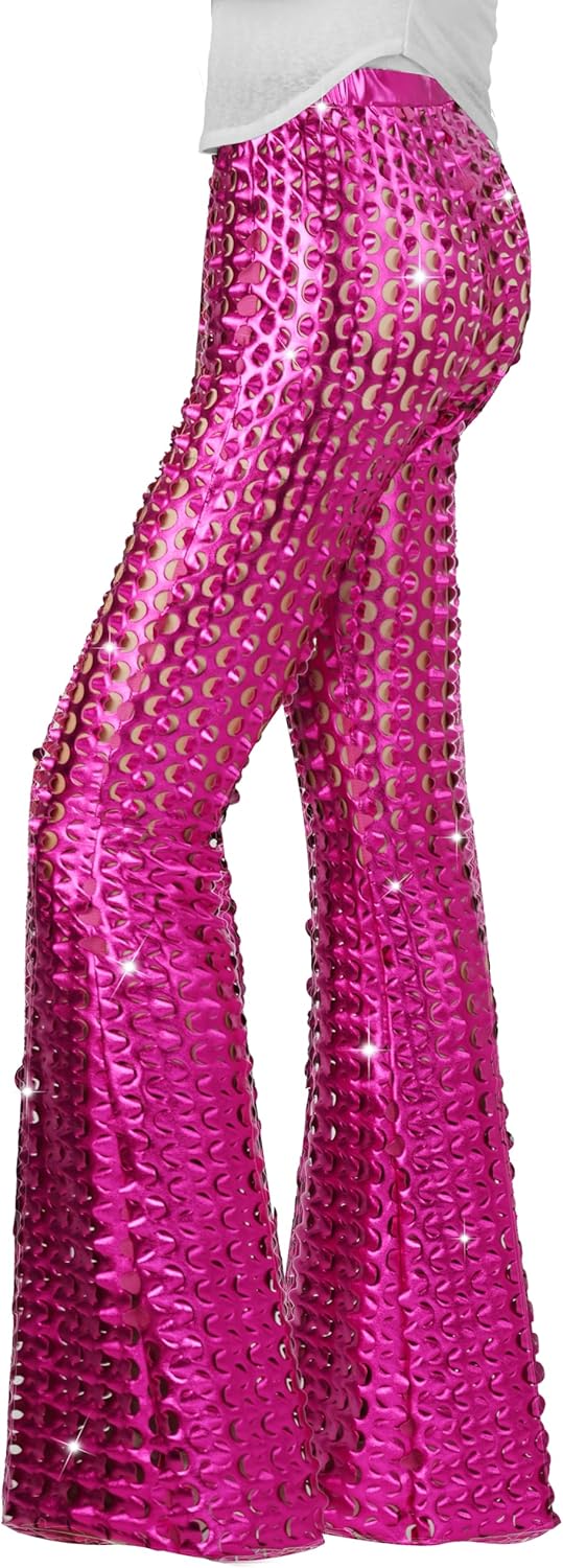 Nawgut Sequin Flare Pants Sparkly Glitter Bell Bottom High Waisted Hollow Trousers Party Clubwear for Women