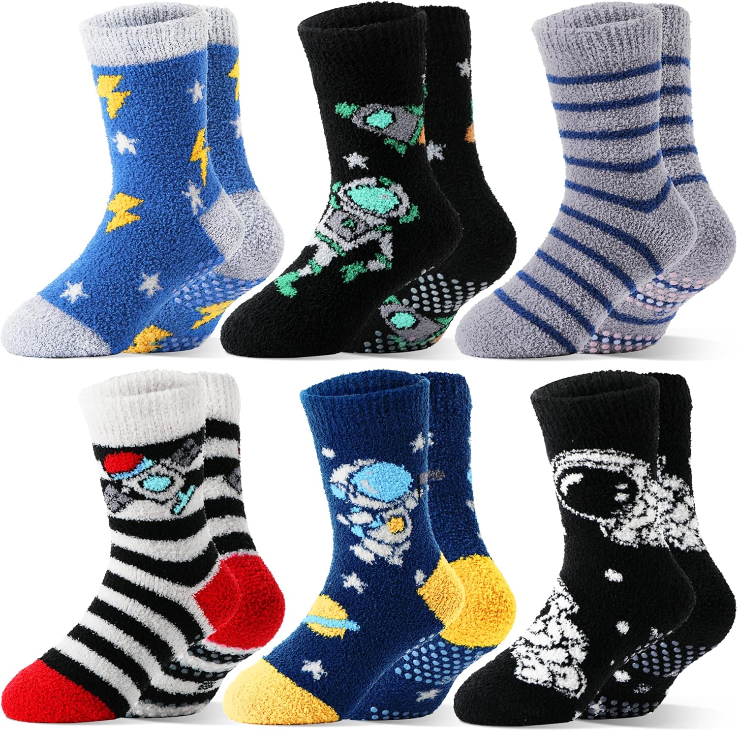 MOGGEI Kids Boys Toddlers Fuzzy Slipper Grips Socks Non Slip Warm Winter Fluffy Cozy Thick Fun Crew Gripper Socks 6 Pairs