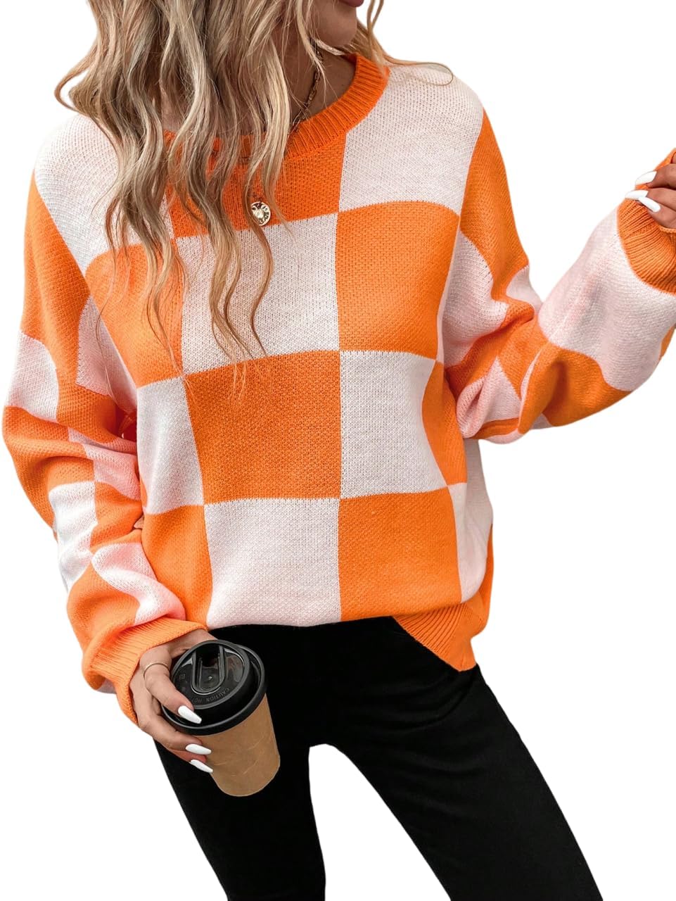 GORGLITTER Women's Argyle Checkered Sweater Plaid Long Sleeve Fall Knit Sweater Pullover Tops