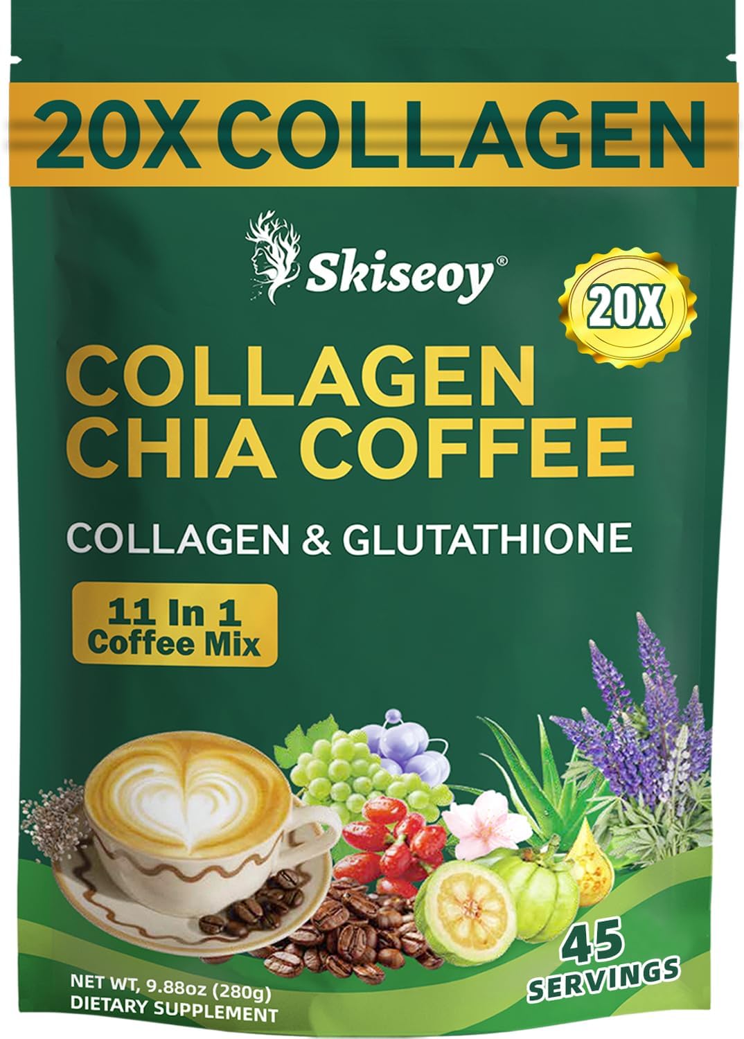 20x Collagen Chia Coffee - 11-in-1 Coffee Shape Mix with Collagen & Chia Seeds, L-Glutathione for Skin, Hair - Boost Energy and Improve Focus, Vegan Friendly, 45 Servings