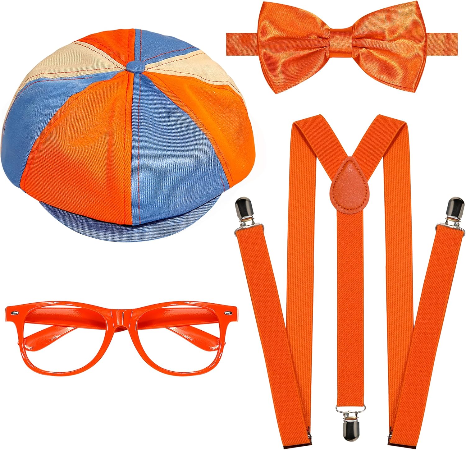 4PCS Halloween Costume Accessories Set for Kids - Blue & Orange Hat, Orange Suspender, Bow-tie and Glasses for Boys Girls Themed Party Dress Up